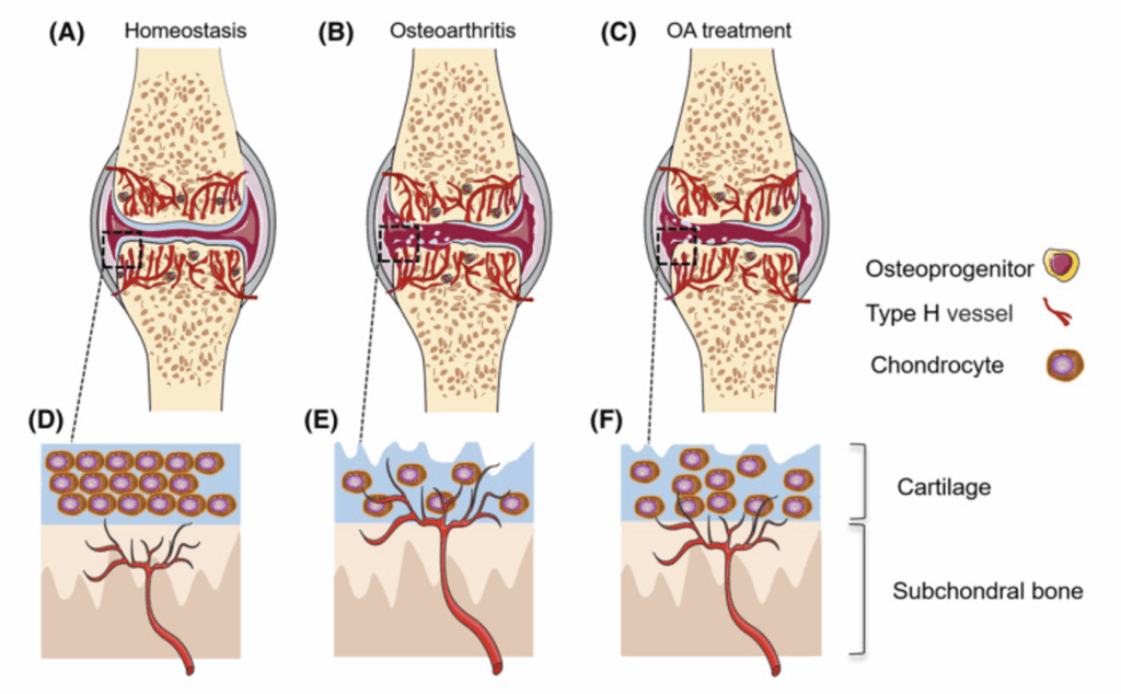 HBOT:lla subkondraalisen luun rakenne ja H-tyypin verisuonten invaasio rustoon paranevat luun korjautumisen ja uudistumisen aikana (C, F).