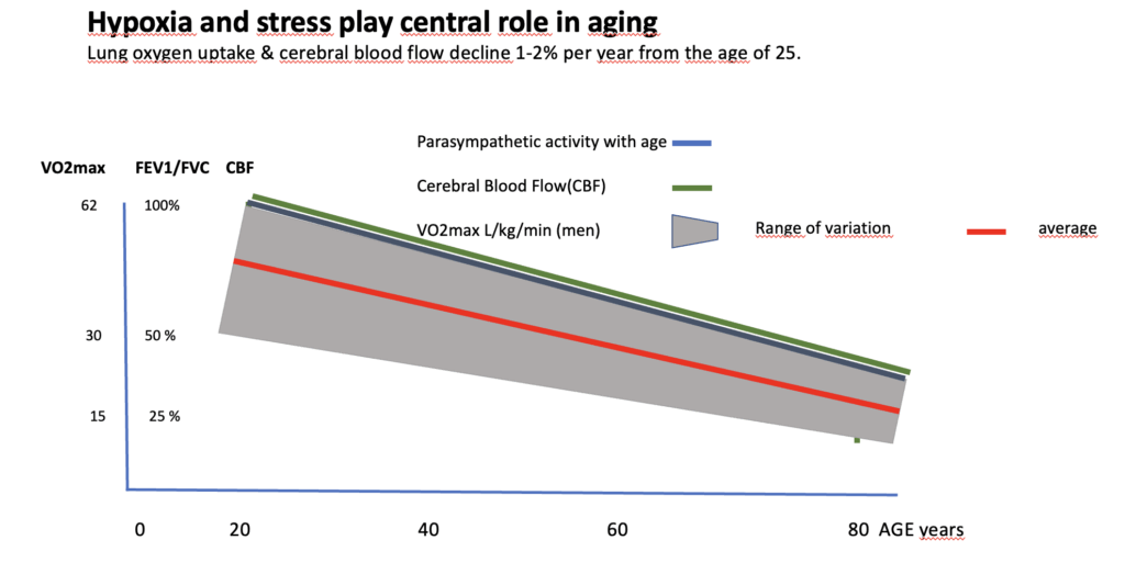 Ikääntymisen ja suhteellisen hapen puutteen (hypoksian) välille voidaan asettaa yhtäläisyysmerkki (”Aging and hypoxia can be equated”).