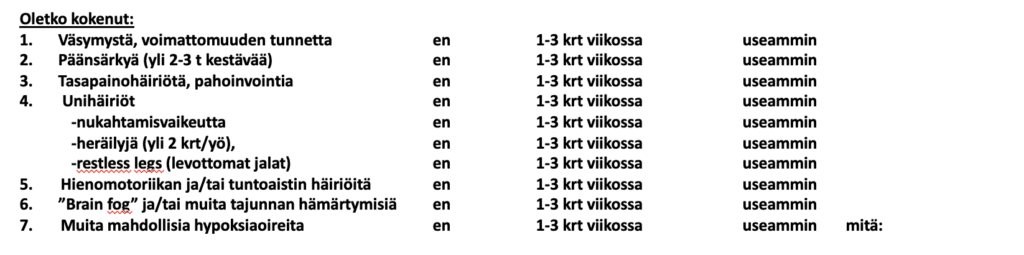 Lievä tilapäinen hapenpuute aivoissa on ikääntyneillä erittäin tavallista. Mitkään kuvantamis- tai muut tutkimukset eivät luotettavasti paljasta sitä. Ainoa keino on oireitten kartoitus. Oheisena kysely lievän tilapäisen tai paikallisen aivojen hapenpuutteen oireista. Ympäröi oikea vaihtoehto: